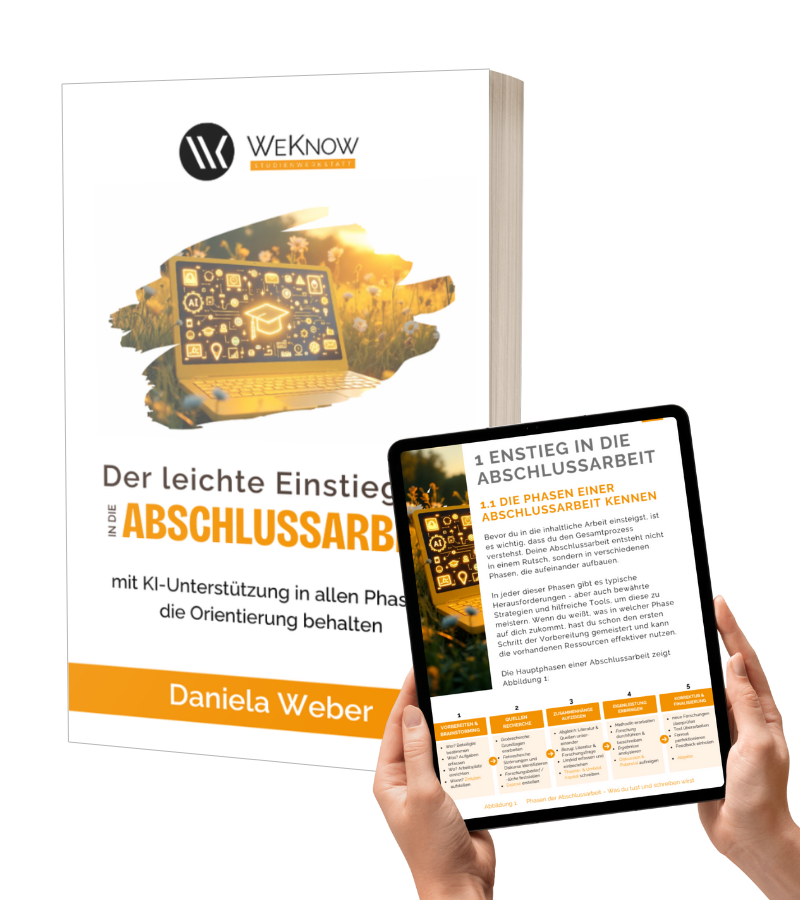 Du suchst Unterstützung bei deiner Bachelorarbeit? Hier findest du unsere Angebote zum Kennenlernen: das Kompaktskript „Der leichte Einstieg in die Abschlussarbeit“, das KI-Tool-Board und die Live-Webinare. In Workshops und Kursen gibt es weitere Ressourcen, die dir beim wissenschaftlichen Arbeiten helfen.