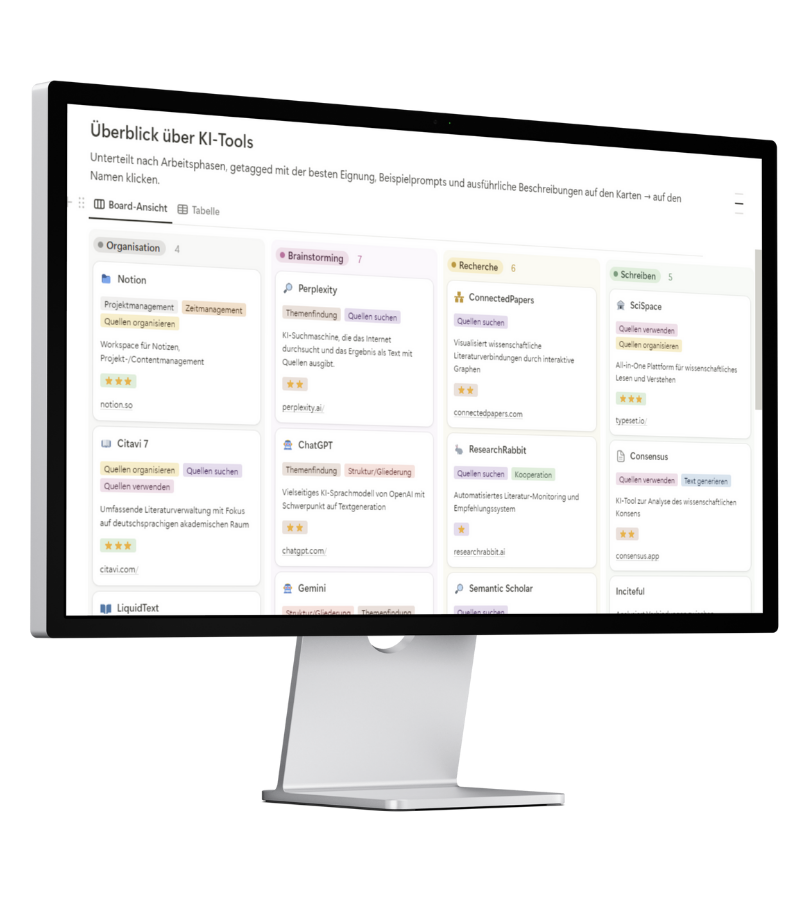 KI-Tool-Board: Überblick über die Tools zu den Phasen einer Abschlussarbeit